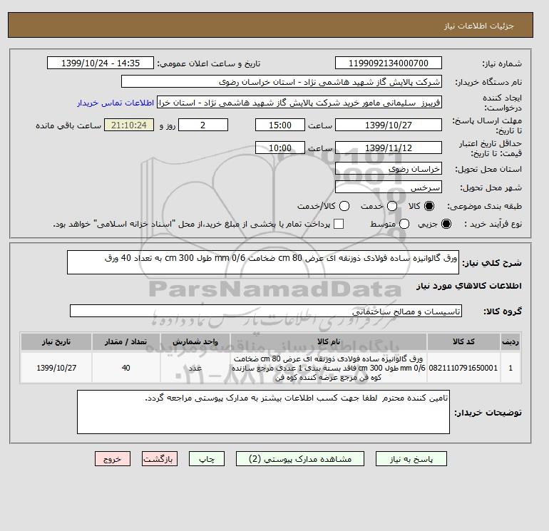 نام دستگاه خریدار:شرکت پالایش گاز شهید هاشمی نژاد - استان خراسان رضوی