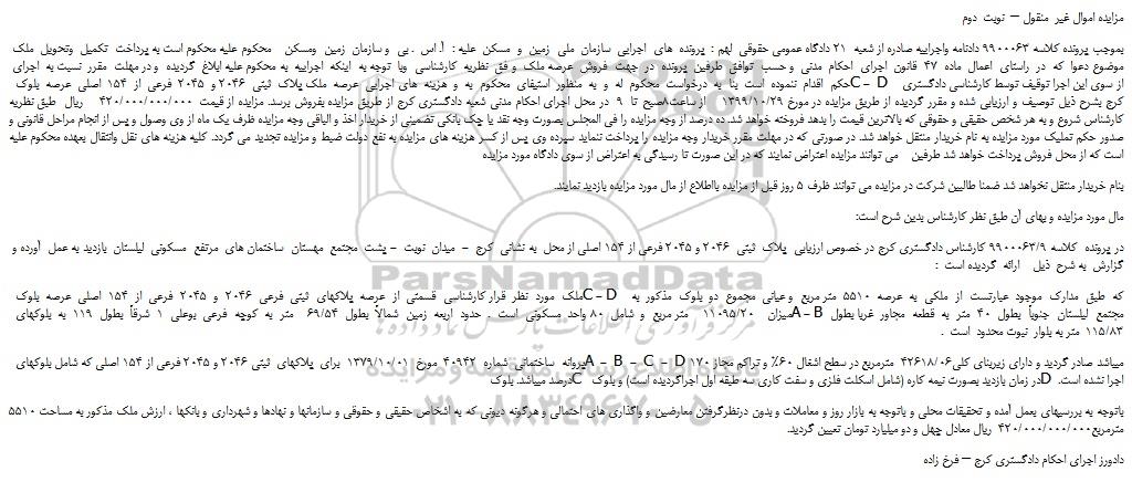 بموجب پرونده کلاسه 9900063 دادنامه واجراییه صادره از شعبه  21 دادگاه عمومی حقوقی  لهم :  پرونده  های  اجرایی  سازمان  ملی  زمین  و  مسکن  علیه :  آ. اس  . بی  و سازمان  زمین  ومسکن    محکوم علیه محکوم است به پرداخت  تکمیل  وتحویل  ملک  موضوع دعوا  که  در  راستای  اعمال  ماده  47  قانون  اجرای  احکام  مدنی  و حسب  توافق  طرفین  پرونده  در  جهت  فروش  عرصه ملک  و فق  نظریه  کارشناسی  وبا  توجه به  اینکه  اجراییه  به محکوم علیه ابلاغ  گردیده  و در مهلت  مقرر  نسبت به  اجرای  حکم  اقدام  ننموده  است  بنا  به  درخواست  محکوم  له  و  به  منظور  استیفای  محکوم  به  و  هزینه  های اجرایی  عرصه  ملک پلاک  ثبتی  2046 و  2045  فرعی  از  154  اصلی  عرصه  بلوک  C -  D    از سوی این اجرا توقیف توسط کارشناسی دادگستری کرج بشرح ذیل توصیف و ارزیابی شده و مقرر گردیده از طریق مزایده در مورخ 1399/10/29    از ساعت8صبح تا  9  در محل اجرای احکام مدنی شعبه دادگستری کرج از طریق مزایده بفروش برسد. مزایده از قیمت  420/000/000/000    ریال  طبق نظریه کارشناس شروع و به هر شخص حقیقی و حقوقی که بالاترین قیمت را بدهد فروخته خواهد شد. ده درصد از وجه مزایده را فی المجلس بصورت وجه نقد یا چک بانکی تضمینی از خریدار اخذ و الباقی وجه مزایده ظرف یک ماه از وی وصول و پس از انجام مراحل قانونی و صدور حکم تملیک مورد مزایده به نام خریدار منتقل خواهد شد. در صورتی که در مهلت مقرر خریدار وجه مزایده را پرداخت ننماید سپرده وی پس از کسر هزینه های مزایده به نفع دولت ضبط و مزایده تجدید می گردد. کلیه هزینه های نقل وانتقال بعهده محکوم علیه است که از محل فروش پرداخت خواهد شد طرفین    می توانند مزایده اعتراض نمایند که در این صورت تا رسیدگی به اعتراض از سوی دادگاه مورد مزایده