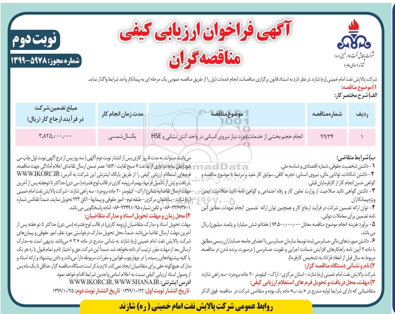 شرکت پالایش نفت امام خمینی (ره) شازند در نظر دارد به استناد قانون برگزاری مناقصات انجام خدمات ذیل را از طریق مناقصه عمومی یک مرحله ای به پیمانکار واجد شرایط واگذار نماید.