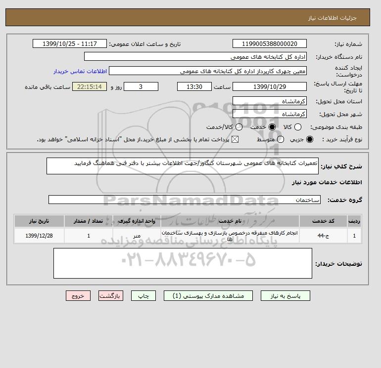 شرح کلی نیاز: تعمیرات کتابخانه های عمومی شهرستان کنگاور/جهت اطلاعات بیشتر با دفتر فنی هماهنگ فرمایید