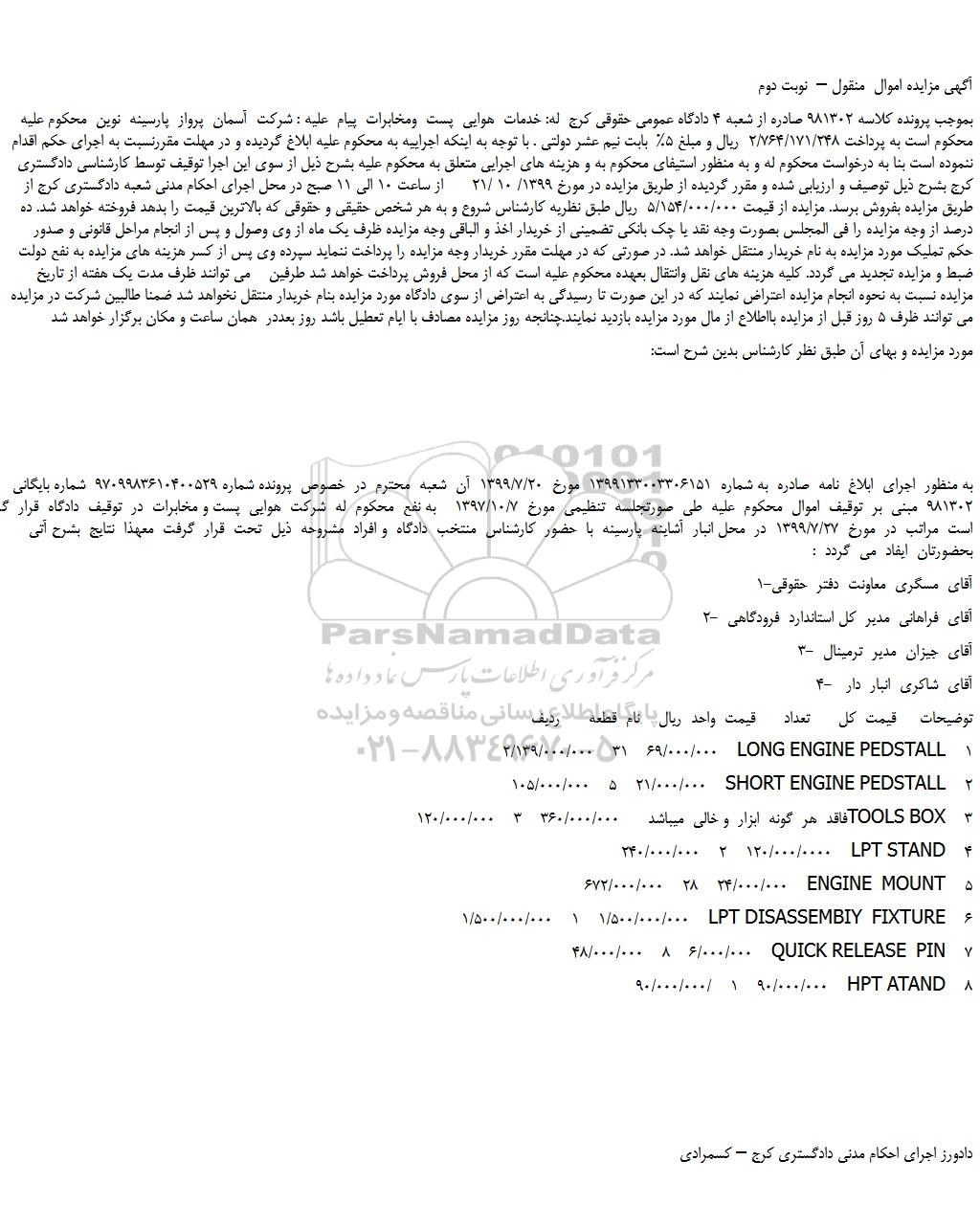 بموجب پرونده کلاسه 981302 صادره از شعبه 4 دادگاه عمومی حقوقی کرج  له: خدمات  هوایی  پست  ومخابرات  پیام  علیه : شرکت  آسمان  پرواز  پارسینه  نوین  محکوم علیه محکوم است به پرداخت 2/764/171/248  ریال و مبلغ 5%  بابت نیم عشر دولتی . با توجه به اینکه اجراییه به محکوم علیه ابلاغ گردیده و در مهلت مقررنسبت به اجرای حکم اقدام ننموده است بنا به درخواست محکوم له و به منظور استیفای محکوم به و هزینه های اجرایی متعلق به محکوم علیه بشرح ذیل از سوی این اجرا توقیف توسط کارشناسی دادگستری کرج بشرح ذیل توصیف و ارزیابی شده و مقرر گردیده از طریق مزایده در مورخ 1399/ 10 /21      از ساعت 10 الی 11 صبح در محل اجرای احکام مدنی شعبه دادگستری کرج از طریق مزایده بفروش برسد. مزایده از قیمت 5/154/000/000  ریال طبق نظریه کارشناس شروع و به هر شخص حقیقی و حقوقی که بالاترین قیمت را بدهد فروخته خواهد شد. ده درصد از وجه مزایده را فی المجلس بصورت وجه نقد یا چک بانکی تضمینی از خریدار اخذ و الباقی وجه مزایده ظرف یک ماه از وی وصول و پس از انجام مراحل قانونی و صدور حکم تملیک مورد مزایده به نام خریدار منتقل خواهد شد. در صورتی که در مهلت مقرر خریدار وجه مزایده را پرداخت ننماید سپرده وی پس از کسر هزینه های مزایده به نفع دولت ضبط و مزایده تجدید می گردد. کلیه هزینه های نقل وانتقال بعهده محکوم علیه است که از محل فروش پرداخت خواهد شد طرفین    می توانند ظرف مدت یک هفته از تاریخ مزایده نسبت به نحوه انجام مزایده اعتراض نمایند که در این صورت تا رسیدگی به اعتراض از سوی دادگاه مورد مزایده بنام خریدار منتقل نخواهد شد ضمنا طالبین شرکت در مزایده می توانند ظرف 5 روز قبل از مزایده بااطلاع از مال مورد مزایده بازدید نمایند.چنانجه روز مزایده مصادف با ایام تعطیل باشد روز بعددر  همان ساعت و مکان برگزار خواهد شد