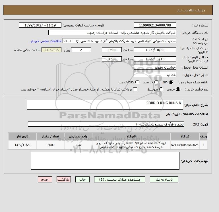 شرح کلی نیاز: CORD O-RING BUNA-N