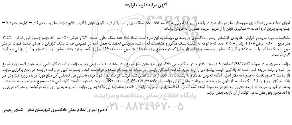 اجرای احکام مدنی دادگستری شهرستان سقز در نظر دارد در رابطه با پرونده اجرائی به کلاسه 9900594، سنگ تزیینی نما واقع در سنگبری تابان با آدرس دقیق: جاده سقز بسمت بوکان – کیلومتر حدود 7 – جنب پمپ بنزین تازه احداث – سنگبری تابان را از طریق مزایده حضوری به فروش برساند.