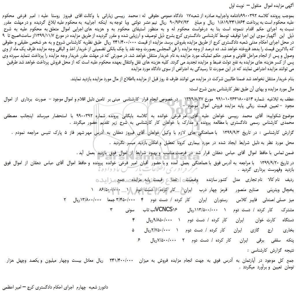 بموجب پرونده کلاسه 9900392دادنامه واجراییه صادره از شعبه17  دادگاه عمومی حقوقی  له : محمد  رییسی زیارانی  با  وکالت اقای  فیروز  روستا  علیه :  امیر  فرخی  محکوم علیه محکوم است به پرداخت 1/819/341/864  ریال  و مبلغ    90/967/93  ریال  نیم عشر  دولتی  وبا  توجه به  اینکه  اجراییه  به محکوم علیه ابلاغ  گردیده  و در مهلت  مقرر  نسبت به  اجرای  حکم  اقدام  ننموده  است  بنا  به  درخواست  محکوم  له  و  به  منظور  استیفای  محکوم  به  و  هزینه  های اجرایی  اموال  متعلق به  محکوم  علیه  به  شرح  ذیل  این  آگهیاز سوی این اجرا توقیف توسط کارشناسی دادگستری کرج بشرح ذیل توصیف و ارزیابی شده و مقرر گردیده از طریق مزایده در مورخ 1399/11/7از ساعت8صبح تا  9 در محل اجرای احکام مدنی شعبه دادگستری کرج از طریق مزایده بفروش برسد. مزایده از قیمت 241/400/000 ریال  طبق نظریه کارشناس شروع و به هر شخص حقیقی و حقوقی که بالاترین قیمت را بدهد فروخته خواهد شد. ده درصد از وجه مزایده را فی المجلس بصورت وجه نقد یا چک بانکی تضمینی از خریدار اخذ و الباقی وجه مزایده ظرف یک ماه از وی وصول و پس از انجام مراحل قانونی و صدور حکم تملیک مورد مزایده به نام خریدار منتقل خواهد شد. در صورتی که در مهلت مقرر خریدار وجه مزایده را پرداخت ننماید سپرده وی پس از کسر هزینه های مزایده به نفع دولت ضبط و مزایده تجدید می گردد. کلیه هزینه های نقل وانتقال بعهده محکوم علیه است که از محل فروش پرداخت خواهد شد طرفین    می توانند مزایده اعتراض نمایند که در این صورت تا رسیدگی به اعتراض از سوی دادگاه مورد مزایده