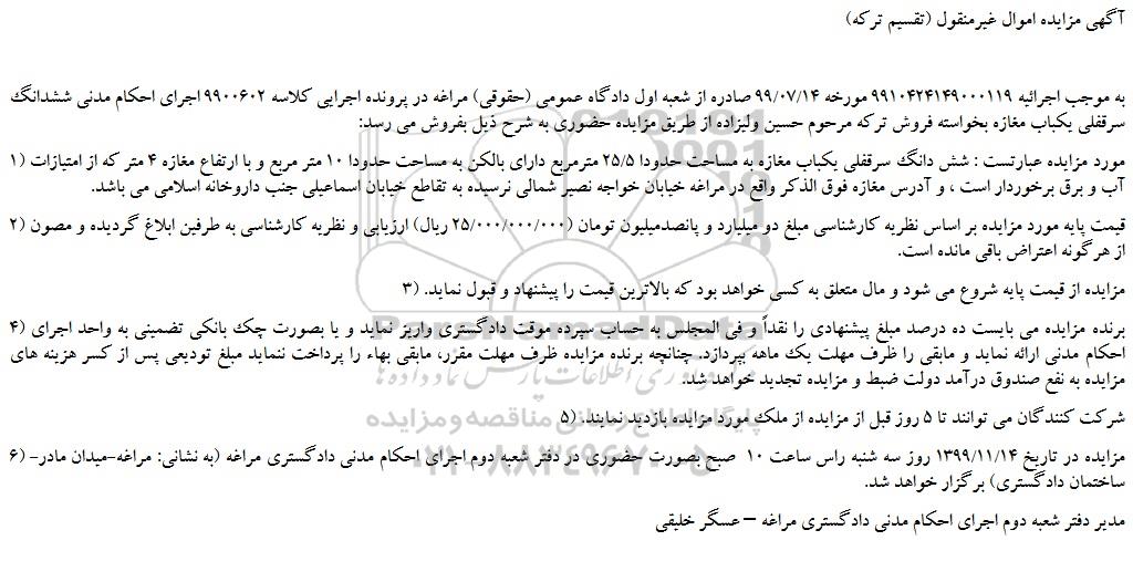 به موجب اجرائیه 9910424149000119 مورخه 99/07/14 صادره از شعبه اول دادگاه عمومی (حقوقی) مراغه در پرونده اجرایی کلاسه 9900602 اجرای احکام مدنی ششدانگ سرقفلی یکباب مغازه بخواسته فروش ترکه مرحوم حسین ولیزاده از طریق مزایده حضوری به شرح ذیل بفروش می رسد: