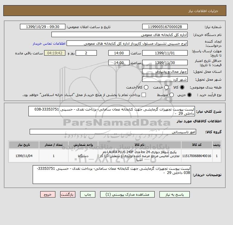 شرح کلی نیاز: لیست پیوست تجهیزات گرمایشی جهت کتابخانه عمان سامانی- پرداخت نقدی - حسینی 33353751-038 داخلی 29 -