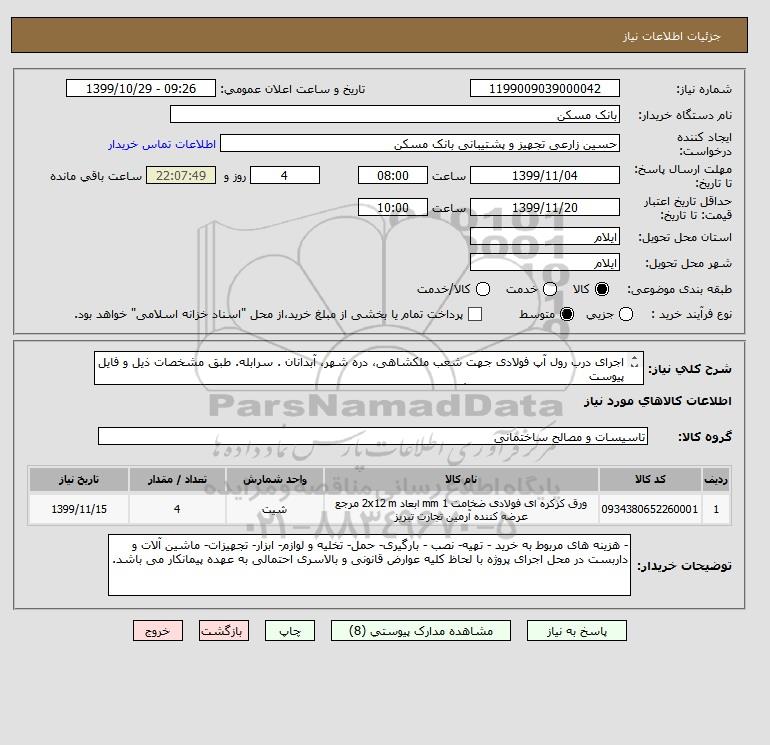 شرح کلی نیاز: اجرای درب رول آپ فولادی جهت شعب ملکشاهی، دره شهر، آبدانان . سرابله. طبق مشخصات ذیل و فایل پیوست