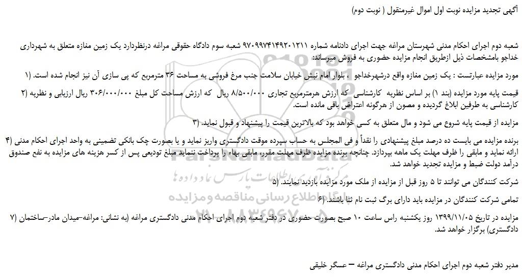 شعبه دوم اجرای احکام مدنی شهرستان مراغه جهت اجرای دادنامه شماره 9709974149201211 شعبه سوم دادگاه حقوقی مراغه درنظردارد یک زمین مغازه متعلق به شهرداری خداجو بامشخصات ذیل ازطریق انجام مزایده حضوری به فروش میرساند: