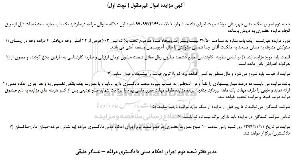 7) مزایده در تاریخ 1399/11/11 روز شنبه راس ساعت 10 صبح بصورت حضوری در دفتر شعبه دوم اجرای احکام مدنی دادگستری مراغه (به نشانی: مراغه-میدان مادر-ساختمان دادگستری) برگزار خواهد شد.