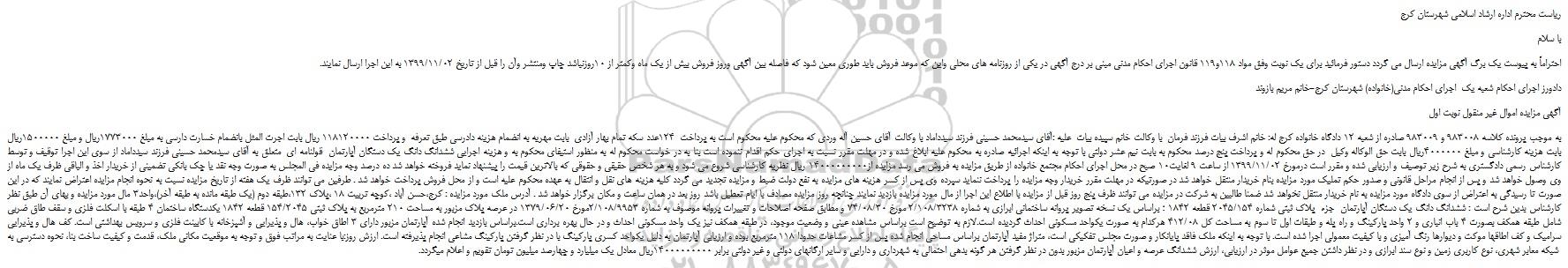 به موجب پرونده کلاسه 983008 و 983009 صادره از شعبه 12 دادگاه خانواده کرج له: خانم اشرف بیات فرزند فرمان با وکالت خانم سپیده بیات علیه :آقای سیدمحمد حسینی فرزند سیدداماد با وکالت آقای حسین آله وردی که محکوم علیه محکوم است به پرداخت 124عدد سکه تمام بهار آزادی بابت مهریه به انضمام هزینه دادرسی طبق تعرفه و پرداخت 118120000 ریال بابت اجرت المثل بانضمام خسارت دارسی به مبلغ 1773000ریال و مبلغ 1500000ریال بابت هزینه کارشناسی و مبلغ 4000000ریال بابت حق الوکاله وکیل در حق محکوم له و پرداخت پنج درصد محکوم به بابت نیم عشر دولتی با توجه به اینکه اجرائیه صادره به محکوم علیه ابلاغ شده و در مهلت مقرر نسبت به اجرای حکم اقدام ننموده است بنا به در خواست محکوم له به منظور استیفای محکوم به و هزینه اجرایی ششدانگ دانگ یک دستگان آپارتمان قولنامه ای متعلق به آقای سیدمحمد حسینی فرزند سیدداماد از سوی این اجرا توقیف و توسط کارشناس رسمی دادگستری به شرح زیر توصیف و ارزیابی شده و مقرر است درمورخ 1399/11/02 از ساعت 9 لغایت10 صبح در محل اجرای احکام مجتمع خانواده از طریق مزایده به فروش می رسد مزایده از14000000000 ریال نظریه کارشناسی شروع می شود و به هر شخص حقیقی و حقوقی که بالاترین قیمت را پیشنهاد نماید فروخته خواهد شد ده درصد وجه مزایده فی المجلس به صورت وجه نقد یا چک بانکی تضمینی از خریدار اخذ و الباقی ظرف یک ماه از وی وصول خواهد شد و پس از انجام مراحل قانونی و صدور حکم تملیک مورد مزایده بنام خریدار منتقل خواهد شد در صورتیکه در مهلت مقرر خریدار وجه مزایده را پرداخت ننماید سپرده وی پس از کسر هزینه های مزایده به نفع دولت ضبط و مزایده تجدید می گردد کلیه هزینه های نقل و انتقال به عهده محکوم علیه است و از محل فروش پرداخت خواهد شد . طرفین می توانند ظرف یک هفته از تاریخ مزایده نسبت به نحوه انجام مزایده اعتراض نمایند که در این صورت تا رسیدگی به اعتراض از سوی دادگاه مورد مزایده به نام خریدار منتقل نخواهد شد ضمنا طالبین به شرکت در مزایده می توانند ظرف پنج روز قبل از مزایده با اطلاع این اجرا از مال مورد مزایده بازدید نمایند چنانچه روز مزایده مصادف با ایام تعطیل باشد روز بعد در همان ساعت و مکان برگزار خواهد شد . آدرس ملک مورد مزایده : کرج،حسن آباد ،کوچه تربیت 18 ،پلاک 132،طبقه دوم (یک طبقه مانده به طبقه آخر)،واحد3 مال مورد مزایده و بهای آن طبق نظر کارشناس بدین شرح است : ششدانگ دانگ یک دستگان آپارتمان جزء پلاک ثبتی شماره 2045/154 قطعه 1842 ؛ براساس یک نسخه تصویر پروانه ساختمانی ابرازی به شماره 2/108/3238 مورخ 74/08/30 و مطابق صفحه اصلاحات و تغییرات پروانه موصوف به شماره 2/108/9953مورخ 1379/06/20 در عرصه پلاک مزبور به مساحت 210 مترمربع به پلاک ثبتی 154/2045 قطعه 1842 یکدستگاه ساختمان 4 طبقه با اسکلت فلزی و سقف طاق ضربی شامل طبقه همکف بصورت 4 باب انباری و 2 واحد پارکینگ و راه پله و طبقات اول تا سوم به مساحت کل 412/08 هرکدام به صورت یکواحد مسکونی احداث گردیده است.لازم به توضیح است براساس مشاهده عینی و وضعیت موجود، در طبقه همکف نیز یک واحد مسکونی احداث و در حال بهره برداری است.براساس بازدید انجام شده آپارتمان مزبور دارای 3 اطاق خواب، هال و پذیرایی و آشپزخانه با کابینت فلزی و سرویس بهداشتی است. کف هال و پذیرایی سرامیک و کف اطاقها موکت و دیوارها رنگ آمیزی و با کیفیت معمولی اجرا شده است. با توجه به اینکه ملک فاقد پایانکار و صورت مجلس تفکیکی است، متراژ مفید آپارتمان براساس مساحی انجام شده پس از کسر مشاعات حدودا 118 مترمربع بوده و ارزیابی آپارتمان به دلیل یکواحد کسری پارکینگ با در نظر گرفتن پارکینگ مشاعی انجام پذیرفته است. ارزش روز:با عنایت به مراتب فوق و توجه به موقعیت مکانی ملک، قدمت و کیفیت ساخت بنا، نحوه دسترسی به شبکه معابر شهری، نوع کاربری زمین و نوع سند ابرازی و در نظر داشتن جمیع عوامل موثر در ارزیابی، ارزش ششدانگ عرصه و اعیان آپارتمان مزبور بدون در نظر گرفتن هر گونه بدهی احتمالی به شهرداری و دارایی و سا