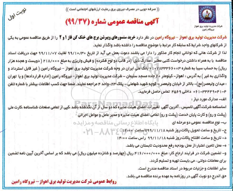 شرکت مدیریت تولید برق اهواز - نیروگاه رامین در نظر دارد خرید سنسورهای ویبرشن برج های خنک کن فاز 1 و 2 را از طریق مناقصه عمومی به یکی از شرکتهای واجد شرایط که سابقه کار مرتبط با موضوع مناقصه را داشته باشد واگذار نماید. لذا از شرکتهایی که توانایی انجام کار مذکور را دارا می باشند دعوت به عمل می آید از تاریخ 99.10.30 لغایت 99.11.7 جهت دریافت اسناد مناقصه با به همراه داشتن درخواست کتبی معتبر مدارک ذیل (در قالب دو لوح فشرده) و فیش واریزی به مبلغ 218.000 (دویست و هجده هزار) ریال به حساب سیبا به شماره 0107833366003 بانک ملی ایران در وجه شرکت مدیریت تولید برق اهواز نیروگاه رامین غیرقابل استرداد و واگذاری به غیر به آدرس اهواز، کیلومتر 20 جاده مسجد سلیمان، شرکت مدیریت تولید برق اهواز، نیروگاه رامین اداره قراردادها و یا به آدرس تهران خیابان ولیعصر عج بالاتر از میدان ولیعصر کوجه شهید شهامتی پلاک 23 واحد 4 مراجعه نمایند. ضمنا جهت کسب اطلاعات بیشتر با شماره تلفن