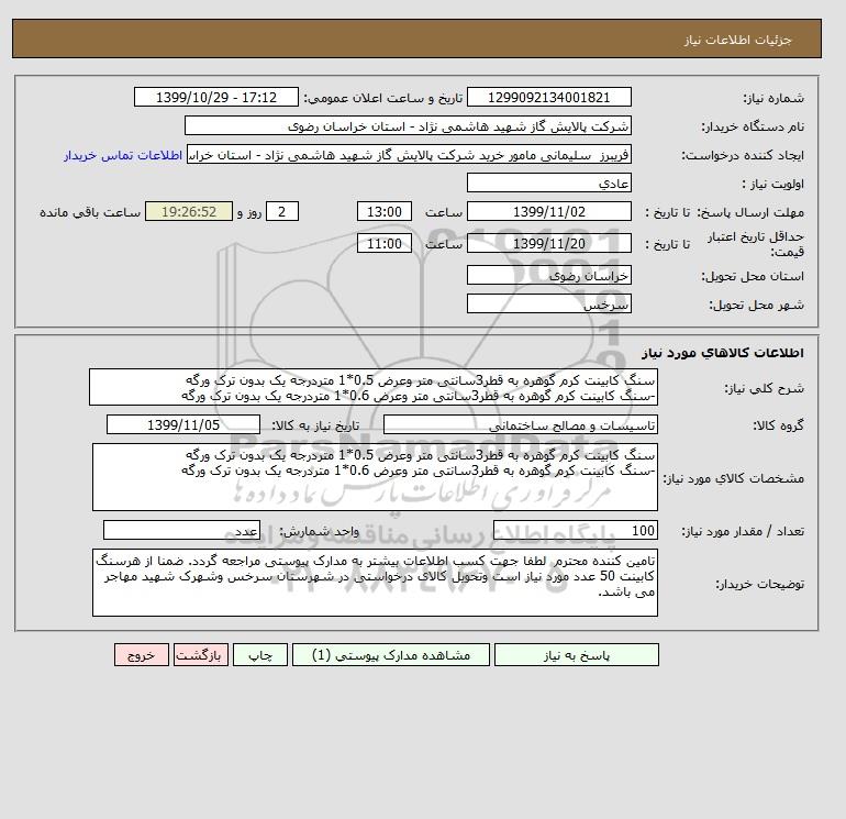 توضیحات خریدار:تامین کننده محترم لطفا جهت کسب اطلاعات بیشتر به مدارک پیوستی مراجعه گردد. ضمنا از هرسنگ کابینت 50 عدد مورد نیاز است وتحویل کالای درخواستی در شهرستان سرخس وشهرک شهید مهاجر می باشد.