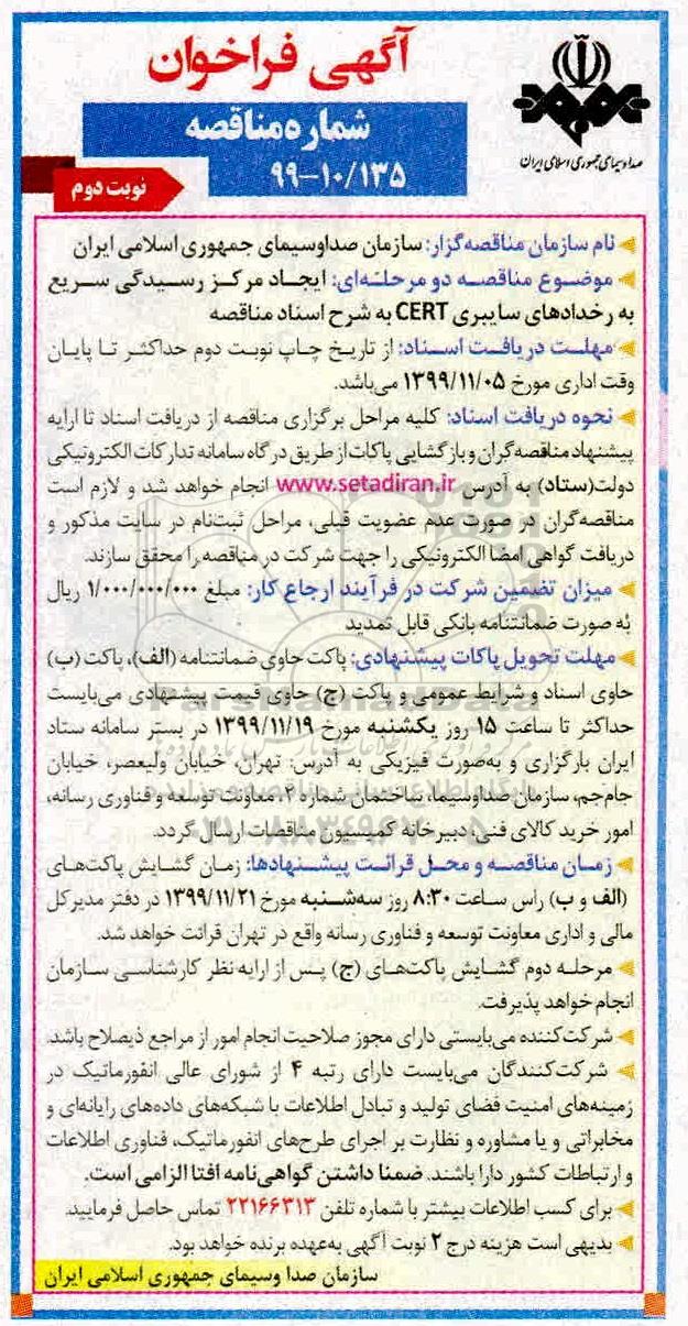 - نام سازمان مناقصه گزار: سازمان صدا و سیمای جمهوری اسلامی ایران