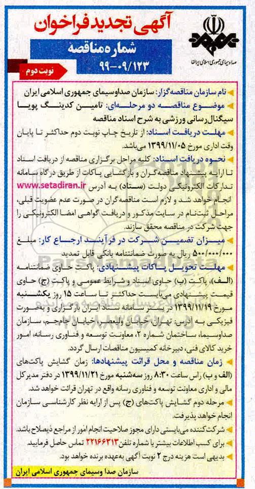 تجدید فراخوان مناقصه تامین کدینگ پویا سیگنال رسانی ورزشی- نوبت دوم , تجدید فراخوان مناقصه, تجدید فراخوان مناقصه تامین کدینگ پویا سیگنال رسانی ورزشی- نوبت دوم
