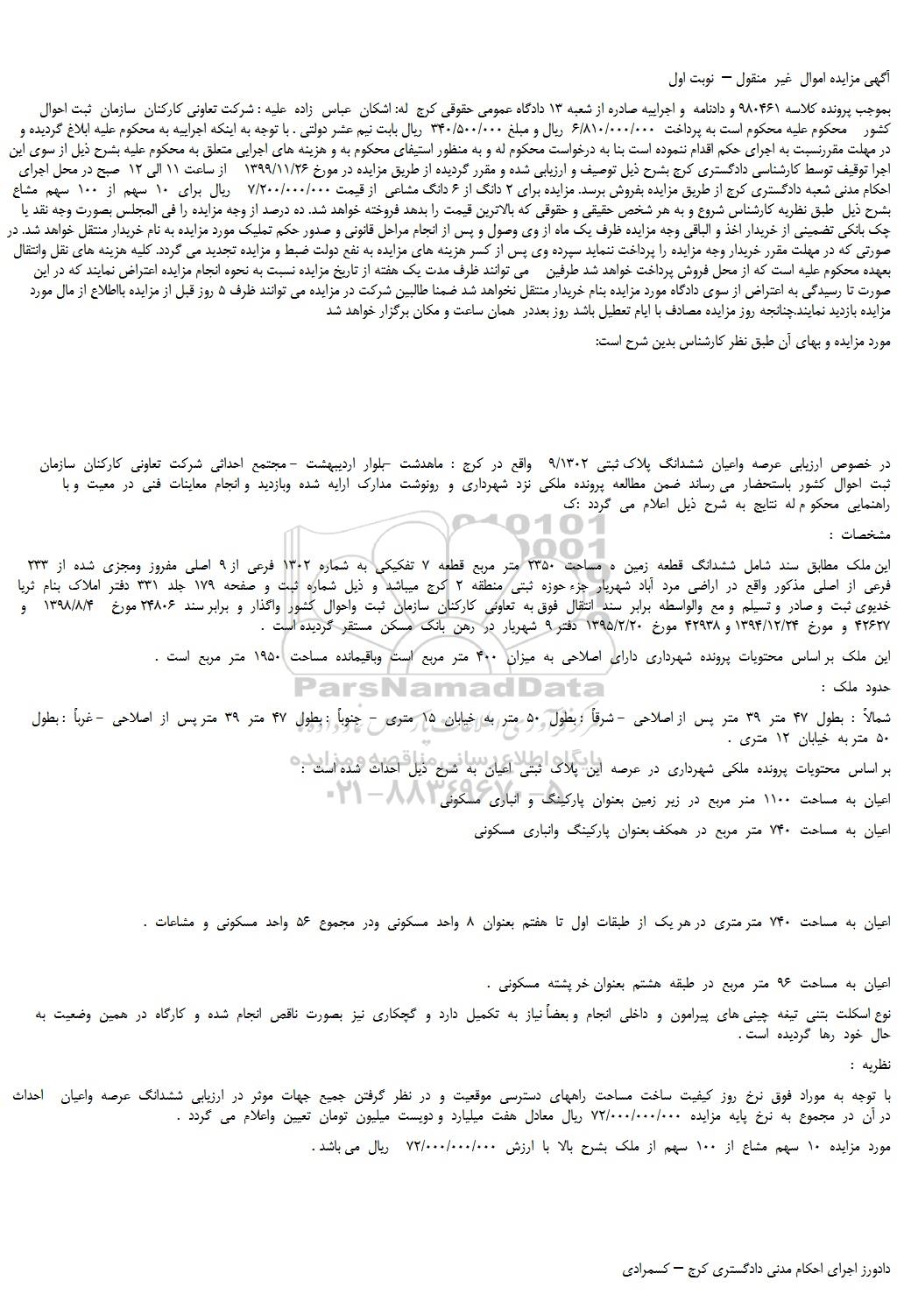 در خصوص ارزیابی عرصه واعیان ششدانگ پلاک ثبتی 9/1302 واقع در کرج : ماهدشت -بلوار اردیبهشت - مجتمع احداثی شرکت تعاونی کارکنان سازمان ثبت احوال کشور باستحضار می رساند ضمن مطالعه پرونده ملکی نزد شهرداری و رونوشت مدارک ارایه شده وبازدید و انجام معاینات فنی در معیت و با راهنمایی محکو م له نتایج به شرح ذیل اعلام می گردد :ک