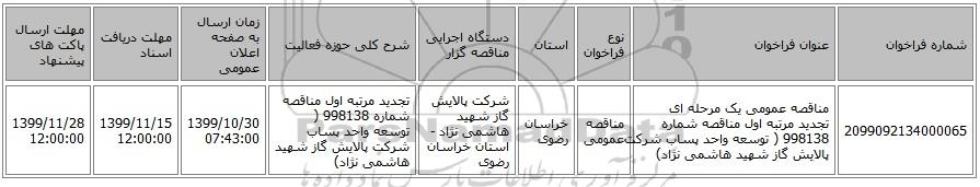 | 2099092134000065 | مناقصه عمومی یک مرحله ای تجدید مرتبه اول مناقصه شماره 998138 ( توسعه واحد پساب شرکت پالایش گاز شهید هاشمی نژاد) | مناقصه عمومی | خراسان رضوی | شرکت پالایش گاز شهید هاشمی نژاد - استان خراسان رضوی | تجدید مرتبه اول مناقصه شماره 998138 ( توسعه واحد پساب شرکت پالایش گاز شهید هاشمی نژاد) | 1399/10/30 07:43:00 | 1399/11/15 12:00:00 | 1399/11/28 12:00:00 |