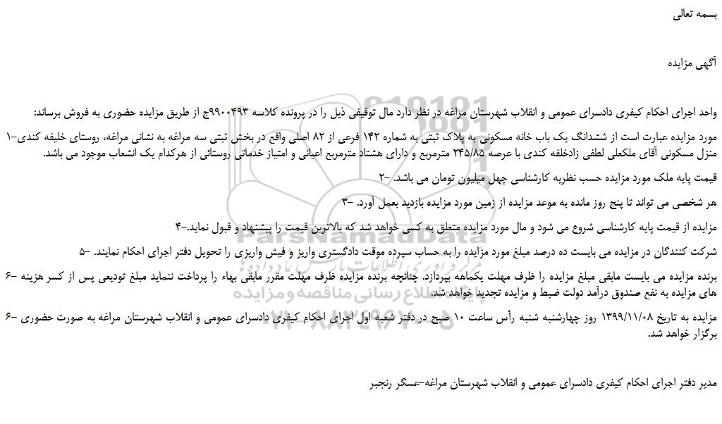 6- مزایده به تاریخ 1399/11/08 روز چهارشنبه شنبه رأس ساعت 10 صبح در دفتر شعبه اول اجرای احکام کیفری دادسرای عمومی و انقلاب شهرستان مراغه به صورت حضوری برگزار خواهد شد.