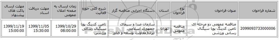 | 2099093733000006 | مناقصه عمومی دو مرحله ای تامین کدینگ پویا سیگنال رسانی ورزشی | مناقصه عمومی | تهران | سازمان صدا و سیمای جمهوری اسلامی ایران(معاونت توسعه و فناور | تامین کدینگ پویا سیگنال رسانی ورزشی | 1399/10/29 08:00:00 | 1399/11/05 15:30:00 | 1399/11/19 15:00:00 |