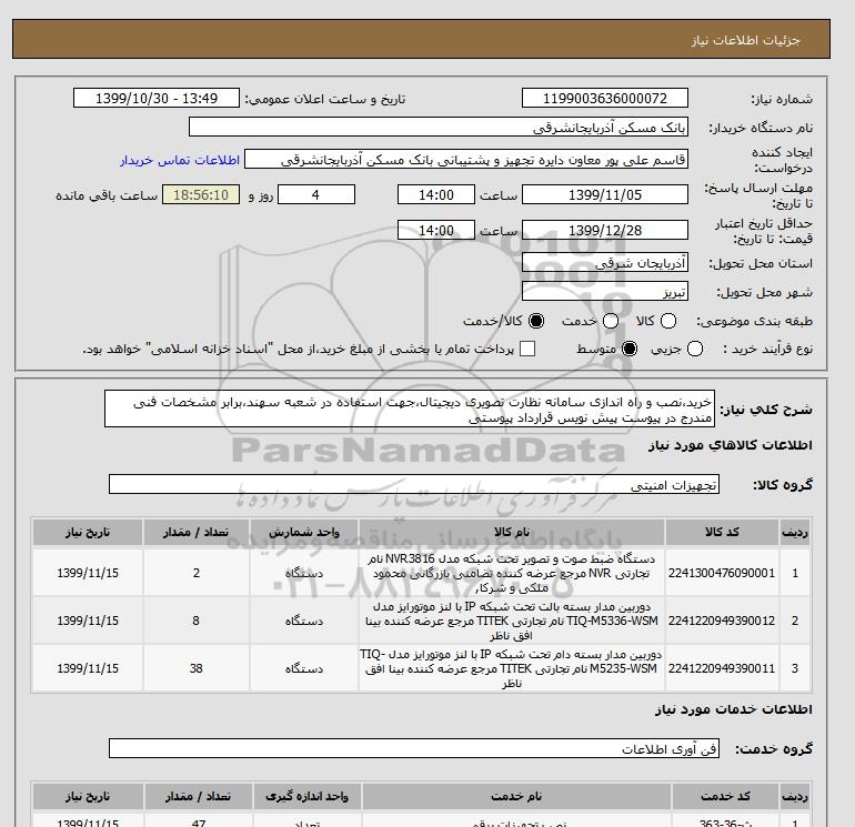 شرح کلی نیاز: خرید،نصب و راه اندازی سامانه نظارت تصویری دیجیتال،جهت استفاده در شعبه سهند،برابر مشخصات فنی مندرج در پیوست پیش نویس قرارداد پیوستی