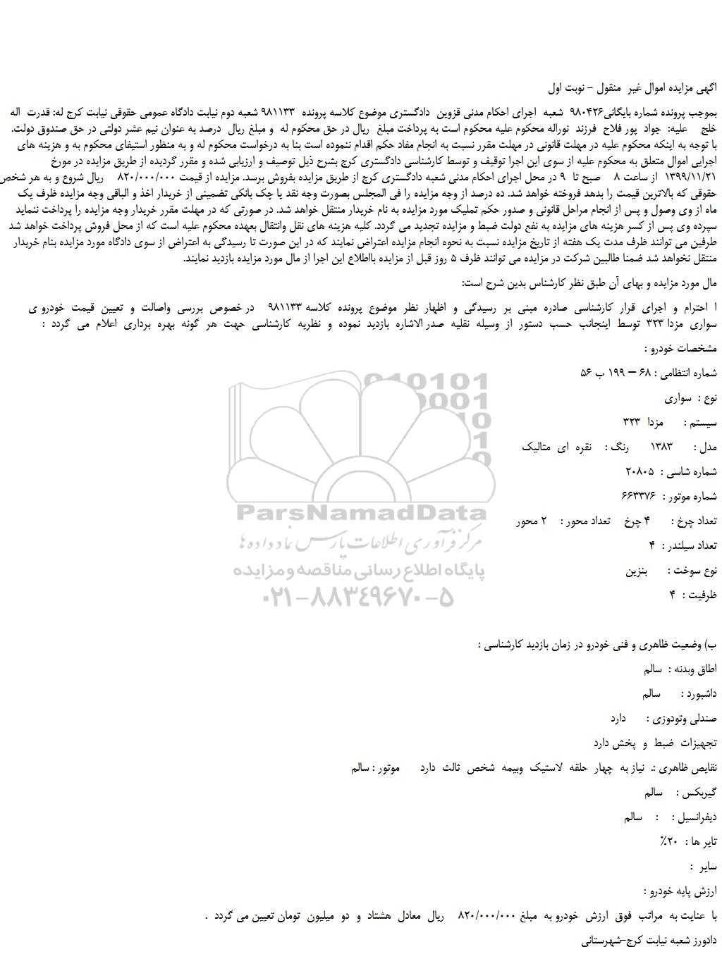بموجب پرونده شماره بایگانی980426 شعبه اجرای احکام مدنی قزوین دادگستری موضوع کلاسه پرونده 981133 شعبه دوم نیابت دادگاه عمومی حقوقی نیابت کرج له: قدرت اله خلج علیه: جواد پور فلاح فرزند نوراله محکوم علیه محکوم است به پرداخت مبلغ ریال در حق محکوم له و مبلغ ریال درصد به عنوان نیم عشر دولتی در حق صندوق دولت. با توجه به اینکه محکوم علیه در مهلت قانونی در مهلت مقرر نسبت به انجام مفاد حکم اقدام ننموده است بنا به درخواست محکوم له و به منظور استیفای محکوم به و هزینه های اجرایی اموال متعلق به محکوم علیه از سوی این اجرا توقیف و توسط کارشناسی دادگستری کرج بشرح ذیل توصیف و ارزیابی شده و مقرر گردیده از طریق مزایده در مورخ 1399/11/21 از ساعت 8 صبح تا 9 در محل اجرای احکام مدنی شعبه دادگستری کرج از طریق مزایده بفروش برسد. مزایده از قیمت 820/000/000 ریال شروع و به هر شخص حقیقی و حقوقی که بالاترین قیمت را بدهد فروخته خواهد شد. ده درصد از وجه مزایده را فی المجلس بصورت وجه نقد یا چک بانکی تضمینی از خریدار اخذ و الباقی وجه مزایده ظرف یک ماه از وی وصول و پس از انجام مراحل قانونی و صدور حکم تملیک مورد مزایده به نام خریدار منتقل خواهد شد. در صورتی که در مهلت مقرر خریدار وجه مزایده را پرداخت ننماید سپرده وی پس از کسر هزینه های مزایده به نفع دولت ضبط و مزایده تجدید می گردد. کلیه هزینه های نقل وانتقال بعهده محکوم علیه است که از محل فروش پرداخت خواهد شد طرفین می توانند ظرف مدت یک هفته از تاریخ مزایده نسبت به نحوه انجام مزایده اعتراض نمایند که در این صورت تا رسیدگی به اعتراض از سوی دادگاه مورد مزایده بنام خریدار منتقل نخواهد شد ضمنا طالبین شرکت در مزایده می توانند ظرف 5 روز قبل از مزایده بااطلاع این اجرا از مال مورد مزایده بازدید نمایند.