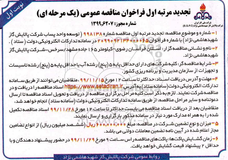 1- شماره و موضوع مناقصه: تجدید مرتبه اول مناقصه شماره 998138 توسعه واحد پساب شرکت پالایش گاز شهید هاشمی نژاد با شماره فراخوان 2099092134000065 در سامانه تدارکات الکترونیکی دولت ستاد