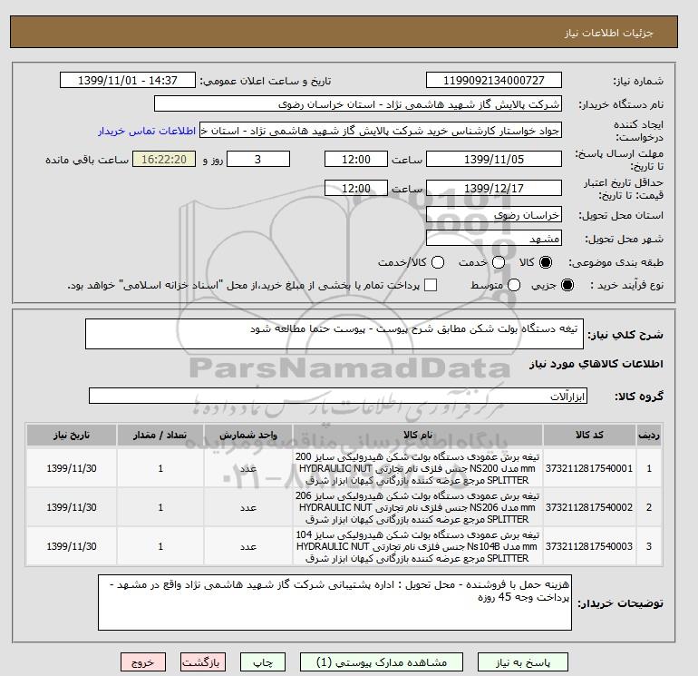 نام دستگاه خریدار:شرکت پالایش گاز شهید هاشمی نژاد - استان خراسان رضوی