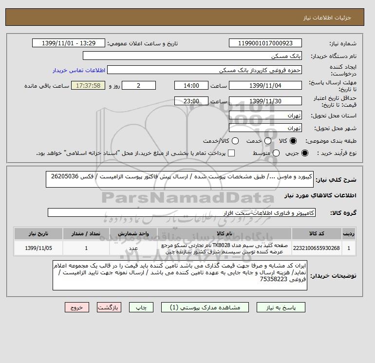 شرح کلی نیاز: کیبورد و ماوس .../ طبق مشخصات پیوست شده / ارسال پیش فاکتور پیوست الزامیست / فکس 26205036