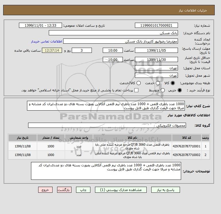 1 | 4297620787710001 | باطری قلمی مدل QT/B 3060 مرجع عرضه کننده علی بابا شاه محمدی | عدد | 1000 | 1399/11/08 |