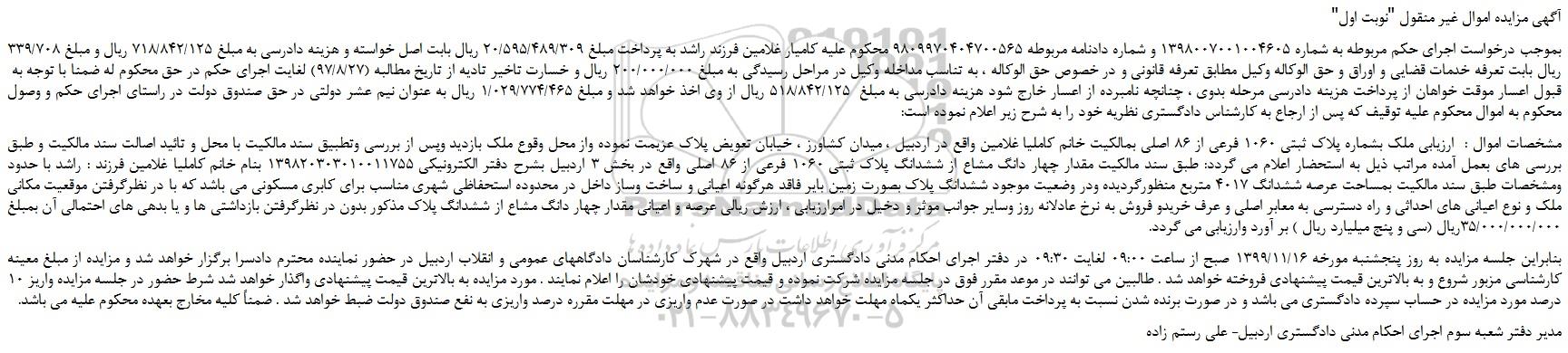 مشخصات اموال :  ارزیابی ملک بشماره پلاک ثبتی 1060 فرعی از 86 اصلی بمالکیت خانم کاملیا غلامین واقع در اردبیل ، میدان کشاورز ، خیابان تعویض پلاک عزیمت نموده واز محل وقوع ملک بازدید وپس از بررسی وتطبیق سند مالکیت با محل و تائید اصالت سند مالکیت و طبق بررسی های بعمل آمده مراتب ذیل به استحضار اعلام می گردد: طبق سند مالکیت مقدار چهار دانگ مشاع از ششدانگ پلاک ثبتی 1060 فرعی از 86 اصلی واقع در بخش 3 اردبیل بشرح دفتر الکترونیکی 139820303010011755 بنام خانم کاملیا غلامین فرزند : راشد با حدود ومشخصات طبق سند مالکیت بمساحت عرصه ششدانگ 4017 متربع منظورگردیده ودر وضعیت موجود ششدانگ پلاک بصورت زمین بایر فاقد هرگونه اعیانی و ساخت وساز داخل در محدوده استحفاظی شهری مناسب برای کابری مسکونی می باشد که با در نظرگرفتن موقعیت مکانی ملک و نوع اعیانی های احداثی و راه دسترسی به معابر اصلی و عرف خریدو فروش به نرخ عادلانه روز وسایر جوانب موثر و دخیل در امرارزیابی ، ارزش ریالی عرصه و اعیانی مقدار چهار دانگ مشاع از ششدانگ پلاک مذکور بدون در نظرگرفتن بازداشتی ها و یا بدهی های احتمالی آن بمبلغ 35/000/000/000ریال (سی و پنج میلیارد ریال ) بر آورد وارزیابی می گردد.
