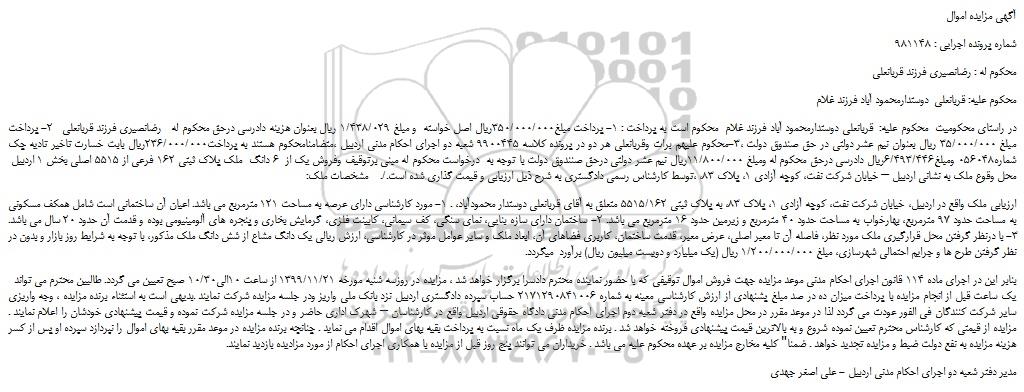 در راستای محکومیت محکوم علیه: قربانعلی دوستدارمحمود آباد فرزند غلام محکوم است به پرداخت : 1- پرداخت مبلغ350/000/000ریال اصل خواسته و مبلغ 1/438/029 ریال بعنوان هزینه دادرسی درحق محکوم له رضانصیری فرزند قربانعلی 2- پرداخت مبلغ 35/000/000 ریال بعنوان نیم عشر دولتی در حق صندوق دولت ،3-محکوم علیهم برات وقربانعلی هر دو در پرونده کلاسه 9900445 شعبه دو اجرای احکام مدنی اردبیل ،متضامنامحکوم هستند به پرداخت236/000/000ریال بابت خسارت تاخیر تادیه چک شماره056048 ومبلغ6/493/446ریال دادرسی درحق محکوم له ومبلغ 11/800/000ریال نیم عشر دولتی درحق صنندوق دولت با توجه به درخواست محکوم له مبنی برتوقیف وفروش یک از 6 دانگ ملک پلاک ثبتی 162 فرعی از 5515 اصلی بخش 1 اردبیل محل وقوع ملک به نشانی اردبیل – خیابان شرکت نفت، کوچه آزادی 1، پلاک 83، ،توسط کارشناس رسمی دادگستری به شرح ذیل ارزیابی و قیمت گذاری شده است./. مشخصات ملک: