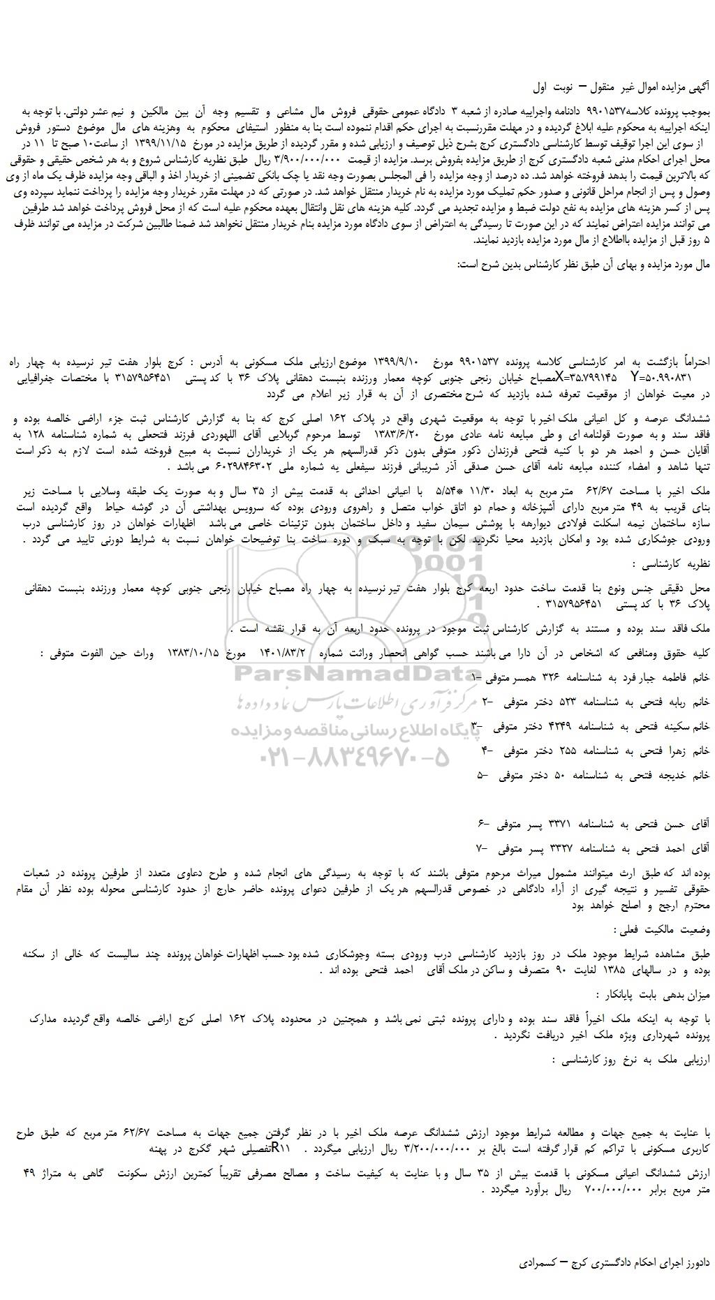 بموجب پرونده کلاسه9901537  دادنامه واجراییه صادره از شعبه 3  دادگاه عمومی حقوقی  فروش  مال  مشاعی  و  تقسیم  وجه  آن  بین  مالکین  و  نیم عشر دولتی. با توجه به اینکه اجراییه به محکوم علیه ابلاغ گردیده و در مهلت مقررنسبت به اجرای حکم اقدام ننموده است بنا به منظور  استیفای  محکوم  به  وهزینه های  مال  موضوع  دستور  فروش    از سوی این اجرا توقیف توسط کارشناسی دادگستری کرج بشرح ذیل توصیف و ارزیابی شده و مقرر گردیده از طریق مزایده در مورخ  1399/11/15  از ساعت10 صبح تا  11 در محل اجرای احکام مدنی شعبه دادگستری کرج از طریق مزایده بفروش برسد. مزایده از قیمت  3/900/000/000 ریال  طبق نظریه کارشناس شروع و به هر شخص حقیقی و حقوقی که بالاترین قیمت را بدهد فروخته خواهد شد. ده درصد از وجه مزایده را فی المجلس بصورت وجه نقد یا چک بانکی تضمینی از خریدار اخذ و الباقی وجه مزایده ظرف یک ماه از وی وصول و پس از انجام مراحل قانونی و صدور حکم تملیک مورد مزایده به نام خریدار منتقل خواهد شد. در صورتی که در مهلت مقرر خریدار وجه مزایده را پرداخت ننماید سپرده وی پس از کسر هزینه های مزایده به نفع دولت ضبط و مزایده تجدید می گردد. کلیه هزینه های نقل وانتقال بعهده محکوم علیه است که از محل فروش پرداخت خواهد شد طرفین    می توانند مزایده اعتراض نمایند که در این صورت تا رسیدگی به اعتراض از سوی دادگاه مورد مزایده بنام خریدار منتقل نخواهد شد ضمنا طالبین شرکت در مزایده می توانند ظرف 5 روز قبل از مزایده بااطلاع از مال مورد مزایده بازدید نمایند.
