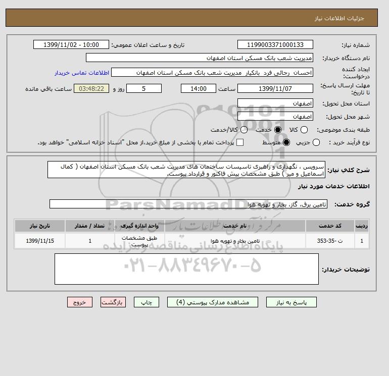 شرح کلی نیاز: سرویس ، نگهداری و راهبری تاسیسات ساختمان های مدیریت شعب بانک مسکن استان اصفهان ( کمال اسماعیل و میر ) طبق مشخصات پیش فاکتور و قرارداد پیوست.