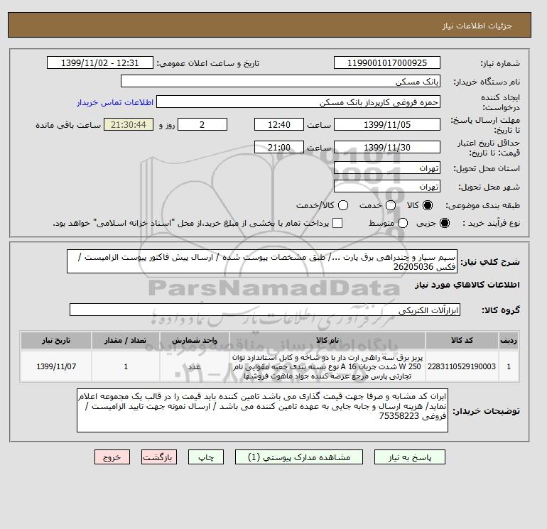 شرح کلی نیاز: سیم سیار و چندراهی برق پارت .../ طبق مشخصات پیوست شده / ارسال پیش فاکتور پیوست الزامیست / فکس 26205036