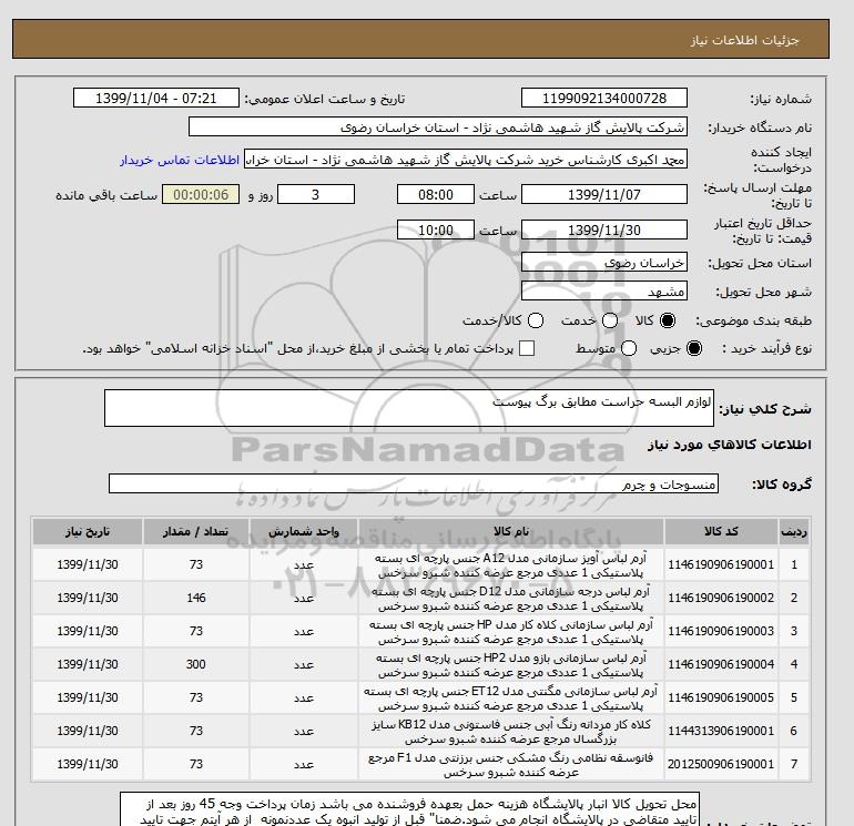 نام دستگاه خریدار:شرکت پالایش گاز شهید هاشمی نژاد - استان خراسان رضوی
