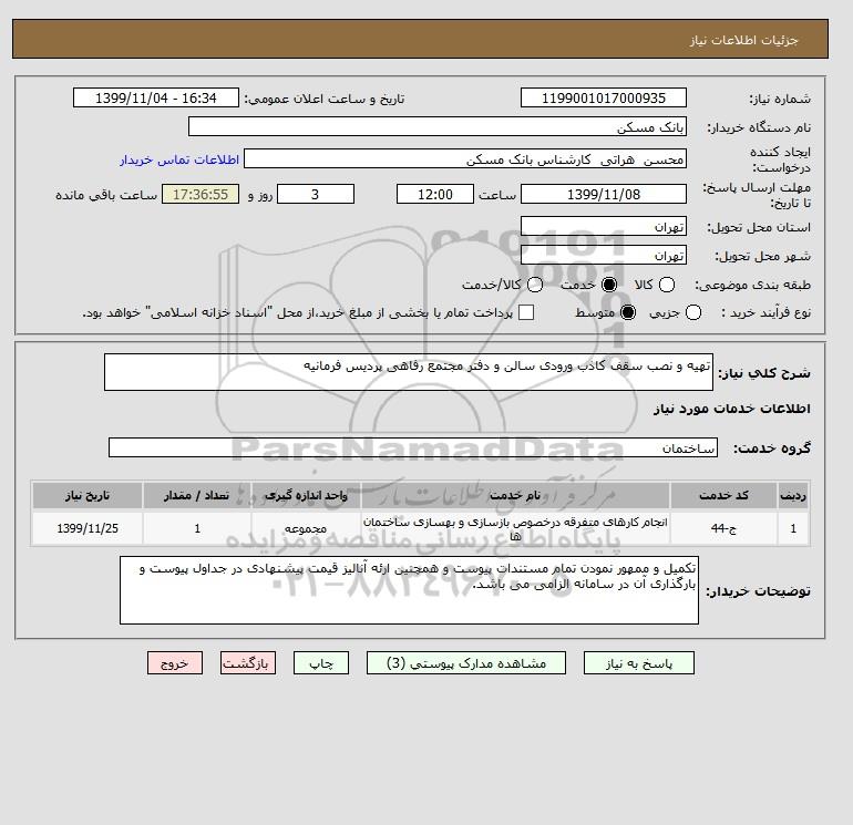 شرح کلی نیاز: تهیه و نصب سقف کاذب ورودی سالن و دفتر مجتمع رفاهی پردیس فرمانیه
