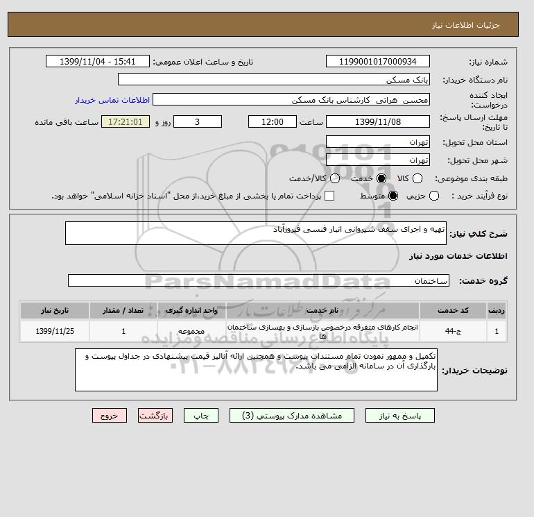 شرح کلی نیاز: تهیه و اجرای سقف شیروانی انبار فنسی فیروزآباد