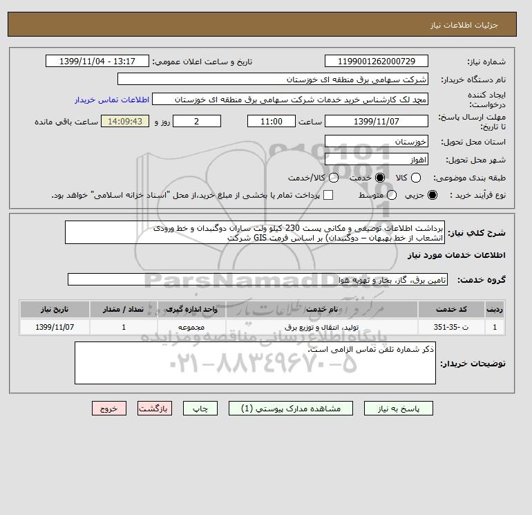 شرح کلی نیاز: برداشت اطلاعات توصیفی و مکانی پست 230 کیلو ولت ساران دوگنبدان و خط ورودی