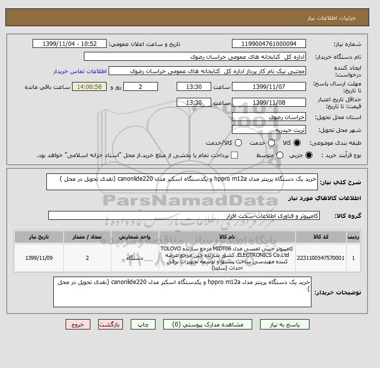 شرح کلی نیاز: خرید یک دستگاه پرینتر مدل hppro m12a و یکدستگاه اسکنر مدل canonlide220 (نقدی تحویل در محل )