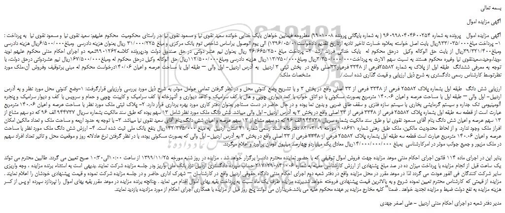 آگهی مزایده اموال پرونده به شماره 9609980404600254 ( به شماره بایگانی پرونده 9901008) مطروحه فیمابین خواهان بابک خدایی خوانده سعید نقوی نیا و مسعود نقوی نیا ،در راستای محکومیت محکوم علیهم: سعید نقوی نیا و مسعود نقوی نیا به پرداخت : 1- پرداخت مبلغ933/035/000ریال بابت اصل خواسته بعلاوه خسارت تاخیر تادیه ازتاریخ تقدیم دادخواست1396/05/01) الی یوم الوصول براساس شاخص توم بانک مرکزی و مبلغ 31/000/225 ریال بعنوان هزینه دادرسی ومبلغ6/500/000ریال هزینه دادرسی ومبلغ39/321/400ریال از بابت حق الوکاله وکیل درحق محکوم له بابک خدائی فرزند ارشد 2- پرداخت مبلغ 46/665/250 ریال بعنوان نیم عشر دولتی در حق صندوق دولت ودرپرونده کلاسه9901262شعبه دو اجرای احکام مدنی محکوم علیهم نوید ،ویدا،وحید،سعیدنقوی نیا وغیره محکوم هستند به نسبت سهم الارث به پرداخت3/350/000/000ریال ومبلغ113/750/000ریال هزینه دادرسی ومبلغ112/500/000ریال حق الوکاله وکیل درحق محکوم له ومبلغ167/500/000ریال نیم عشردولتی درحق دولت، با توجه به معرفی ششدانگ طبقه اول از پلاک به شماره 25582فرعی از 3348 فرعیاز33اصلی واقع در بخش ثبتی 3 اردبیل به آدرس اردبیل- اول والی – طبقه اول با مساحت عرصه و اعیان 140/06درخواست محکوم له مبنی برتوقیف وفروش آن،ملک مورد نظرتوسط کارشناس رسمی دادگستری به شرح ذیل ارزیابی و قیمت گذاری شده است./. مشخصات ملک: