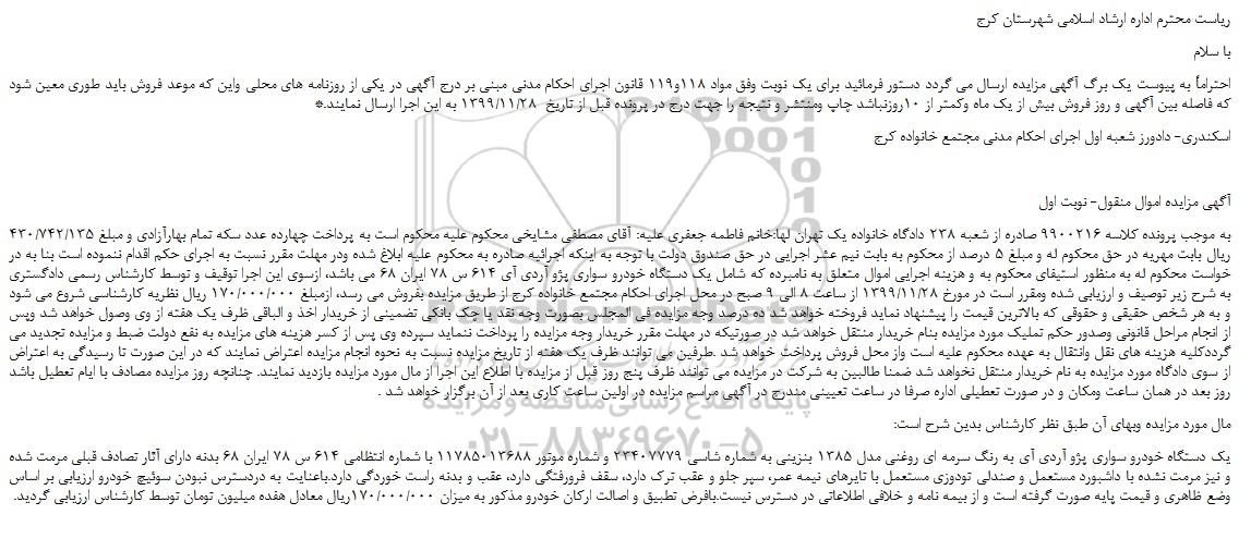 به موجب پرونده کلاسه 9900216 صادره از شعبه 238 دادگاه خانواده یک تهران لها:خانم فاطمه جعفری علیه: آقای مصطفی مشایخی محکوم علیه محکوم است به پرداخت چهارده عدد سکه تمام بهارآزادی و مبلغ 430/742/135 ریال بابت مهریه در حق محکوم له و مبلغ 5 درصد از محکوم به بابت نیم عشر اجرایی در حق صندوق دولت با توجه به اینکه اجرائیه صادره به محکوم علیه ابلاغ شده ودر مهلت مقرر نسبت به اجرای حکم اقدام ننموده است بنا به در خواست محکوم له به منظور استیفای محکوم به و هزینه اجرایی اموال متعلق به نامبرده که شامل یک دستگاه خودرو سواری پژو آردی آی 614 س 78 ایران 68 می باشد، ازسوی این اجرا توقیف و توسط کارشناس رسمی دادگستری به شرح زیر توصیف و ارزیابی شده ومقرر است در مورخ 1399/11/28 از ساعت 8 الی 9 صبح در محل اجرای احکام مجتمع خانواده کرج از طریق مزایده بفروش می رسد، ازمبلغ 170/000/000 ریال نظریه کارشناسی شروع می شود و به هر شخص حقیقی و حقوقی که بالاترین قیمت را پیشنهاد نماید فروخته خواهد شد ده درصد وجه مزایده فی المجلس بصورت وجه نقد یا چک بانکی تضمینی از خریدار اخذ و الباقی ظرف یک هفته از وی وصول خواهد شد وپس از انجام مراحل قانونی وصدور حکم تملیک مورد مزایده بنام خریدار منتقل خواهد شد در صورتیکه در مهلت مقرر خریدار وجه مزایده را پرداخت ننماید سپرده وی پس از کسر هزینه های مزایده به نفع دولت ضبط و مزایده تجدید می گرددکلیه هزینه های نقل وانتقال به عهده محکوم علیه است واز محل فروش پرداخت خواهد شد .طرفین می توانند ظرف یک هفته از تاریخ مزایده نسبت به نحوه انجام مزایده اعتراض نمایند که در این صورت تا رسیدگی به اعتراض از سوی دادگاه مورد مزایده به نام خریدار منتقل نخواهد شد ضمنا طالبین به شرکت در مزایده می توانند ظرف پنج روز قبل از مزایده با اطلاع این اجرا از مال مورد مزایده بازدید نمایند. چنانچه روز مزایده مصادف با ایام تعطیل باشد روز بعد در همان ساعت ومکان و در صورت تعطیلی اداره صرفا در ساعت تعیینی مندرج در آگهی مراسم مزایده در اولین ساعت کاری بعد از آن برگزار خواهد شد .
