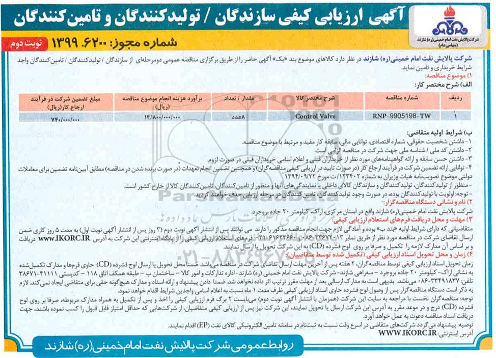 ارزیابی کیفی CONTROL VALVE - نوبت دوم از کلیه افراد متخصص و شرکتها واجد شرایط دعوت به عمل میآید در مناقصه با کد خبرگزاری پارس نماد: 3101483 شرکت نمایند.