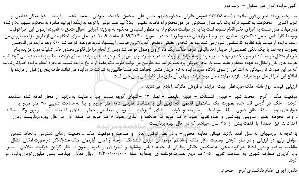 به موجب پرونده  اجرایی فوق صادره از شعبه 18دادگاه عمومی حقوقی  محکوم علیهم  حسن-علی- محسن- خدیجه- حرعلی- محمد- ناهید- -فرشته- زهرا همگی عظیمی  و ثنوبر اکبری    محکومند به تقسیم ترکه یک باب منزل مسکونی  در حق محکوم له فاطمه عظیمی  و5% نیم عشر دولتی با توجه به اینکه اجرائیه صادره به محکوم علیهم ابلاغ شده ودر مهلت مقرر نسبت به اجرای حکم اقدام ننموده است بنا به در خواست محکوم له به منظور استیفای محکوم به وهزینه اجرایی  اموال متعلق به نامبرده ازسوی این اجرا توقیف وتوسط کارشناس رسمی دادگستری به شرح زیر توصیف وارزیابی شده ومقرر است در    مورخ  99/11/20  از ساعت 9تا10  در محل اجرای احکام مدنی از طریق مزایده بفروش می رسد، مزایده از قیمت پایه نظریه کارشناسی  شروع می شود وبه هر شخص حقیقی وحقوقی که بالاترین قیمت را پیشنهاد نماید فروخته خواهد شد 10% وجه مزایده فی المجلس بصورت وجه نقد یا چک بانکی تضمینی از خریدار اخذ والباقی ظرف حداکثر یک ماه از وی وصول خواهد شد وپس از انجام مراحل قانونی وصدور حکم تملیک مورد مزایده بنام خریدار منتقل خواهد شد در صورتیکه در مهلت مقرر خریدار وجه مزایده را پرداخت ننماید سپرده وی پس از کسر هزینه های مزایده به نفع دولت ضبط ومزایده تجدید می گردد کلیه هزینه های نقل وانتقال به عهده محکوم علیه است واز محل فروش پرداخت خواهد شد .طرفین می توانند ظرف یک هفته از تاریخ مزایده نسبت به نحوه انجام مزایده اعتراض نمایند که در این صورت تا رسیدگی به اعتراض از سوی دادگاه مورد مزایده به نام خریدار منتقل نخواهد شد ضمنا طالبین به شرکت در مزایده می توانند ظرف پنج روز قبل از مزایده با اطلاع این اجرا از مال مورد مزایده بازدید نمایند./ مال مورد مزایده وبهای آن طبق نظر کارشناس بدین شرح است:
