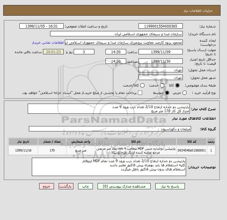توضیحات خریدار:پارتیشن دو جداره ارتفاع 2/10 تعداد درب ورود 9 عدد تمام MDF ایزوفام کلیه استعلام ها باید بهمراه پیش فاکتور معتبر باشد استعلام های بدون پیش فاکتور باطل میگردد