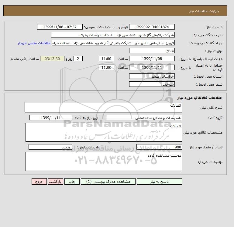 نام دستگاه خریدار:شرکت پالایش گاز شهید هاشمی نژاد - استان خراسان رضوی