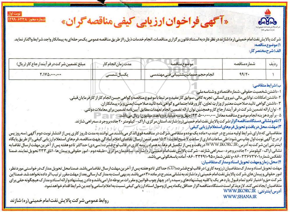 شرکت پالایش نفت امام خمینی (ره) شازند در نظر دارد به استناد قانون برگزاری مناقصات انجام خدمات ذیل را از طریق مناقصه عمومی یک مرحله ای به پیمانکار واجد شرایط واگذار نماید.