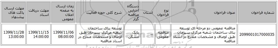 2099001017000035 | مناقصه عمومی دو مرحله ای توسعه بنای ساختمان شعبه مرکزی سیرجان طبق اوصاف و مشخصات مندرج در اسناد مناقصه | مناقصه عمومی | -- | بانک مسکن | توسعه بنای ساختمان شعبه مرکزی سیرجان طبق اوصاف و مشخصات مندرج در اسناد مناقصه | 1399/11/06 08:00:00 | 1399/11/15 14:00:00 | 1399/11/28 13:00:00 |