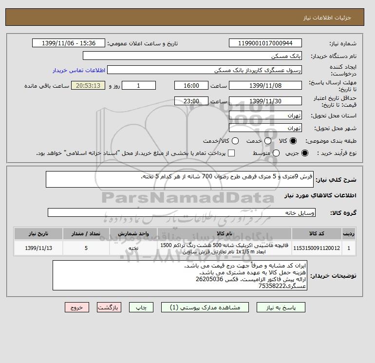 شرح کلی نیاز: فرش 9متری و 5 متری فرهی طرح رضوان 700 شانه از هر کدام 5 تخته.