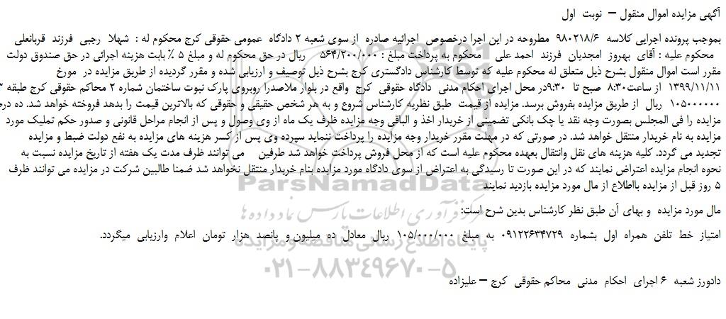 بموجب پرونده اجرایی کلاسه 980218/6 مطروحه در این اجرا درخصوص اجرائیه صادره از سوی شعبه 2 دادگاه عمومی حقوقی کرج محکوم له : شهلا رجبی فرزند قربانعلی محکوم علیه : آقای بهروز امجدیان فرزند احمد علی محکوم به پرداخت مبلغ : 564/200/000 ریال در حق محکوم له و مبلغ 5 % بابت هزینه اجرائی در حق صندوق دولت مقرر است اموال منقول بشرح ذیل متعلق له محکوم علیه که توسط کارشناس دادگستری کرج بشرح ذیل توصیف و ارزیابی شده و مقرر گردیده از طریق مزایده در مورخ 1399/11/11 از ساعت8:30 صبح تا 9:30در محل اجرای احکام مدنی دادگاه حقوقی کرج واقع در بلوار ملاصدرا روبروی پارک نبوت ساختمان شماره 2 محاکم حقوقی کرج طبقه 3 از قیمت 105000000 ریال از طریق مزایده بفروش برسد. مزایده از قیمت طبق نظریه کارشناس شروع و به هر شخص حقیقی و حقوقی که بالاترین قیمت را بدهد فروخته خواهد شد. ده درصد از وجه مزایده را فی المجلس بصورت وجه نقد یا چک بانکی تضمینی از خریدار اخذ و الباقی وجه مزایده ظرف یک ماه از وی وصول و پس از انجام مراحل قانونی و صدور حکم تملیک مورد مزایده به نام خریدار منتقل خواهد شد. در صورتی که در مهلت مقرر خریدار وجه مزایده را پرداخت ننماید سپرده وی پس از کسر هزینه های مزایده به نفع دولت ضبط و مزایده تجدید می گردد. کلیه هزینه های نقل وانتقال بعهده محکوم علیه است که از محل فروش پرداخت خواهد شد طرفین می توانند ظرف مدت یک هفته از تاریخ مزایده نسبت به نحوه انجام مزایده اعتراض نمایند که در این صورت تا رسیدگی به اعتراض از سوی دادگاه مورد مزایده بنام خریدار منتقل نخواهد شد ضمنا طالبین شرکت در مزایده می توانند ظرف 5 روز قبل از مزایده بااطلاع از مال مورد مزایده بازدید نمایند