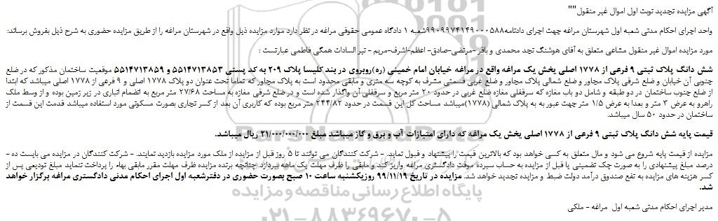"آگهی مزایده تجدید نوبت اول اموال غیر منقول"