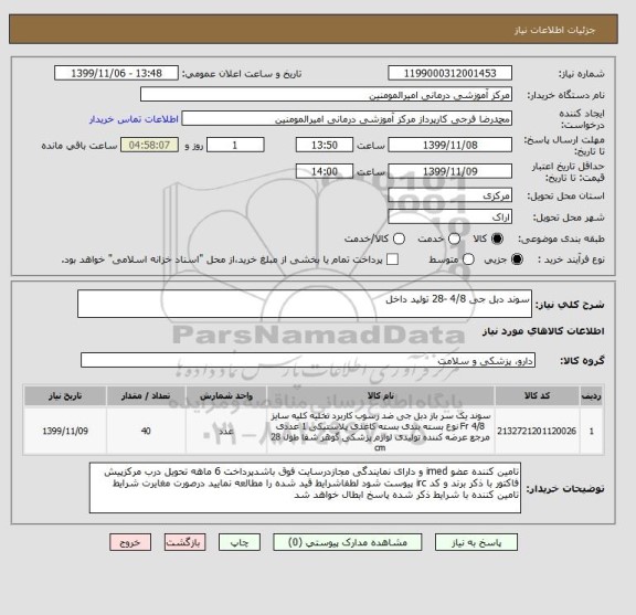 | 1 | 2132721201120026 | سوند یک سر باز دبل جی ضد رسوب کاربرد تخلیه کلیه سایز 4/8 Fr نوع بسته بندی بسته کاغذی پلاستیکی 1 عددی مرجع عرضه کننده تولیدی لوازم پزشکی گوهر شفا طول 28 cm | عدد | 40 | 1399/11/09 |